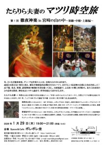 南国とは思えない寒さに震え、眠気や焼酎接待攻撃とたたかいつつ、おそろしい仮面神の出現にときめきましょう!高千穂、米良、椎葉、諸塚神楽の映像&写真を撮って出し。夫婦漫談で、ふるまいの郷土料理から、東大寺お水取りとの意外な関係、神を招ぶシステム論まで、時空を超えて語り尽くします。