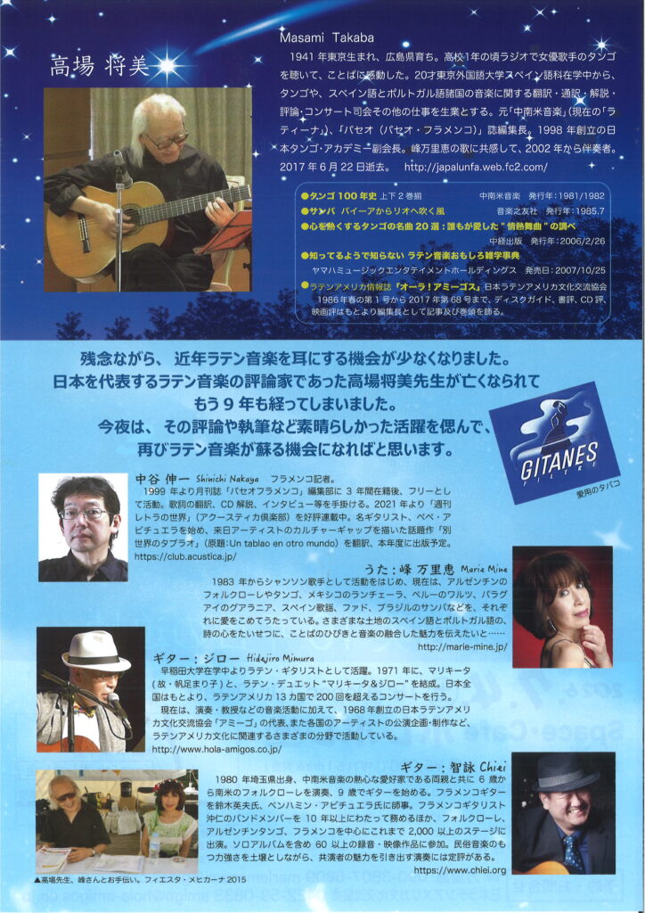 ■出演 : 峰万里恵(うた)、ジロー(ギター)、智詠 Chiei(ギター)、中谷伸一(フラメンコ記者)